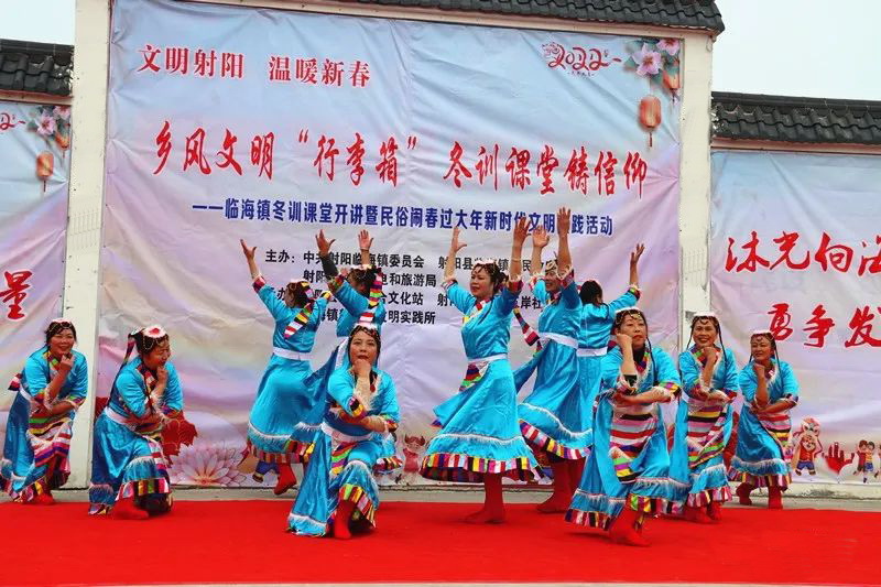 1月19日下午,虽然户外天气阴沉,寒气逼人,但在江苏省射阳县临海镇五岸社区文化广场大舞台上,却呈现出暖意浓浓的态势,在由射阳县临海镇党委、镇政府和射阳县文化广电和旅游局主办,镇新时代文明实践所、综合文化站、五岸社区承办的冬训课堂开讲暨民俗闹春过大年新时代文明实践活动会上,却出现了两支由淮海农场文艺志愿者组成的表演队伍,让乡村党员冬训课堂呈现出场乡文艺共建,共同唱响党建品牌的合作之旅。