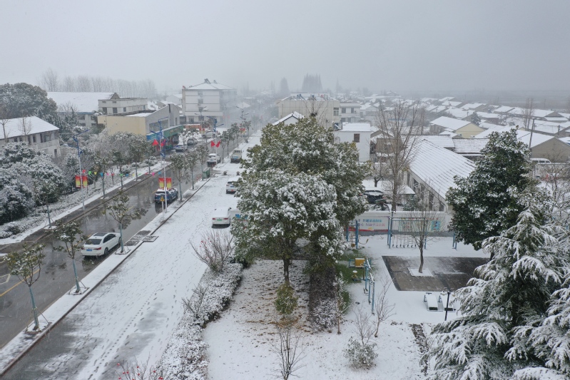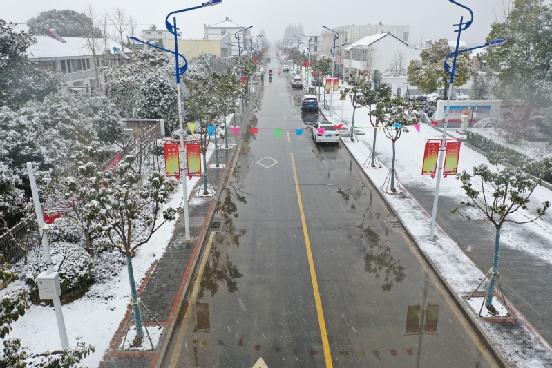 高大的银杏树、柿子树,落光了叶子的枝杈上,一条条毛茸茸、亮晶晶的银条儿好像蛰伏着的蚕虫;修长的香樟、低矮的柏树,四季常青枝叶上,一朵朵蓬松松、沉甸甸的雪球,仿佛举起的棉花糖。“呼……”一辆晨起的公交车闪着光驶过,一面面红旗也迎风雀跃起来,似乎在说“又是一个丰收年”。