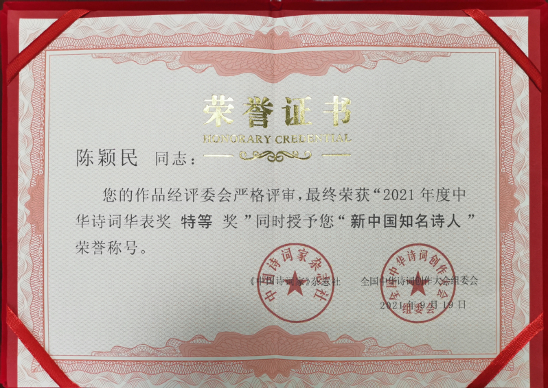 新洋农场退休职工陈颖民在全国中华诗词创作大会组委会举办的中华诗词华表奖中,获得“特等奖”并被授予“新中国知名诗人”荣誉称号。