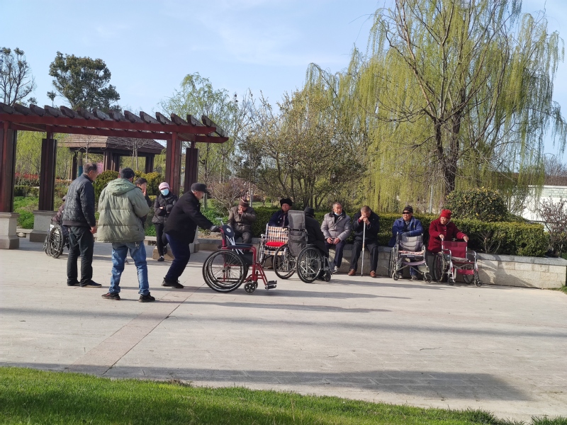 我们发现,来这里休憩的老人中,推着轮椅来的老人特别的多,这些老人中,有自己转着轮椅过来的,也有儿女推着他们过来的。“我爸总是让我将他推到公园中来,他就喜欢与同龄人在一起热闹热闹,这样他的心情才舒畅。”胡铁成的儿子将老人推到公园坐椅着时对我说,“老人怎么说怎么好,我们做儿女的,满足下他们的心愿就好了。图为老人们在一起交谈时的镜头。
