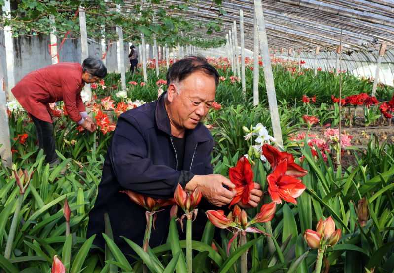 岗埠农场公司周恒银, 和爱人共同种植5栋温室大棚,10年来自己培育朱顶红品种达30个。今年培育朱顶红种苗15万株,年可销切花1万枝,种球2万粒,年收入40万元左右,带动10多户花农走上致富路,2022年3月在农场公司职工代表大会上受到表彰。