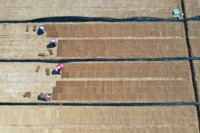 5月1日,宝应湖农场三分场场头一派忙碌,摆盘、铲土、倒稻种,7、8名工人分工合作,有序进行着落谷育秧。