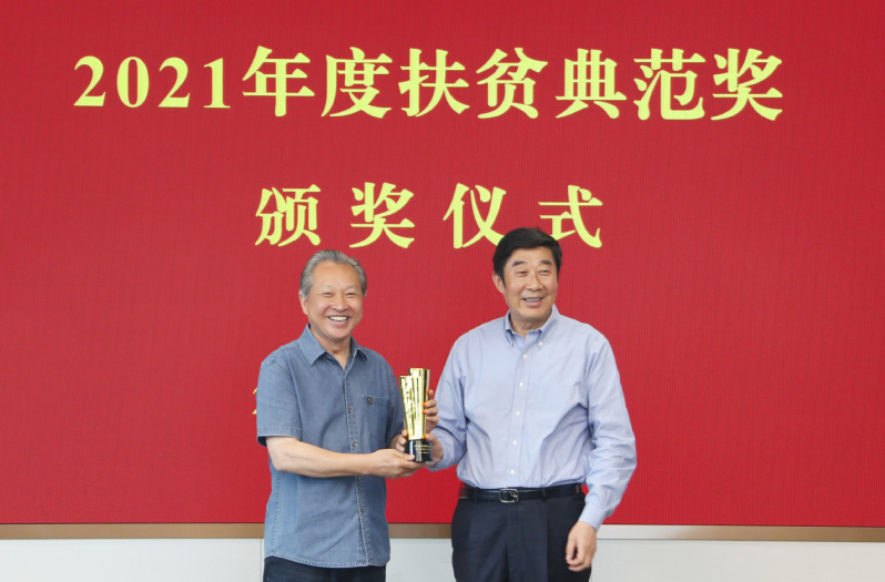 座谈会期间,赵鹏向集团公司颁发了2021年度江苏妇女儿童慈善杰出贡献单位奖牌和第十一届公益节-2021年度扶贫典范奖奖杯。