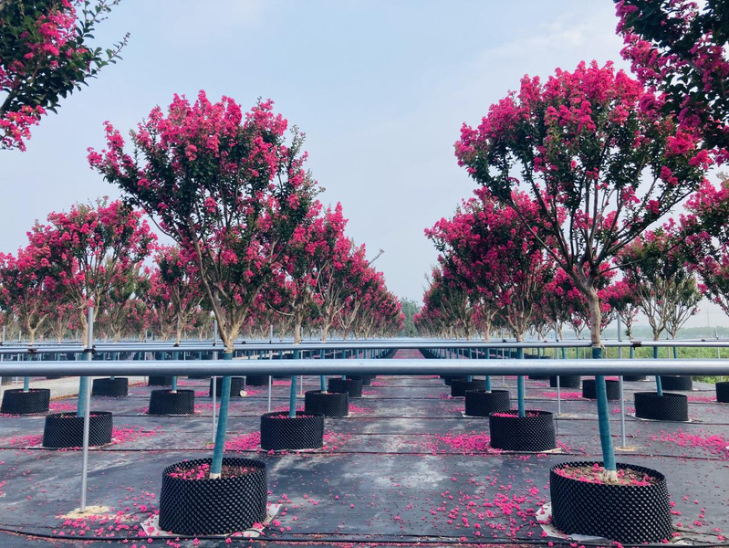 新洋林业公司容器苗三期当下正是一幅花开似霞的盛景,紫薇花团团簇簇挂满枝头,相当夺目。拳头产品“四川红”紫薇是农场公司党委和林业公司4月份顶着疫情的压力,积极争取引进的产品,到了7月份便成为了附近居民的网红打卡产品,获得了居民们的一致好评和称赞。其花期极长,从6月一直持续到10月,宋代杨万里赞曰:“谁道花无红百日,紫薇常放半年花。”明代薛蕙诗云:“紫薇开最久,烂漫十旬期。”因此,紫薇也有“百日红”之称。
