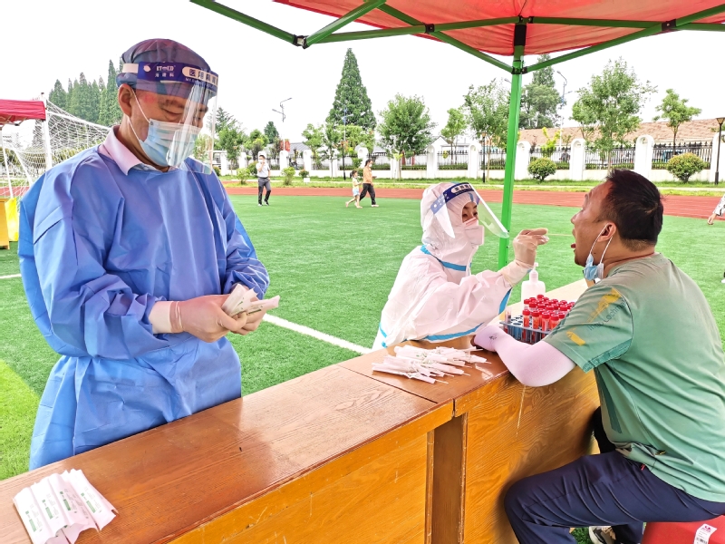 把广场当战场,在团结协作中恪尽职守。早晨五点半,居民们陆续赶来参加核酸检测。只见徐加云一身蓝色防护服,头戴隔离面罩,手着橡胶手套,行色匆匆地忙碌在服务一线。指导扫码、测量体温、维持两米线……看到需要引导的居民,他主动上前做起引导员;遇到腿脚不灵便的老人,他连忙搀扶做起志愿者;碰到哪个点位需要人手,他自愿加入做起服务员。温度迅速攀升,衣服早已干了又湿,他却毫不在意。拿起消毒喷壶,他仔细地为采样台、医用垃圾箱、人员等候区等处消毒。为缩短居民等待时间,加快采样速度,他提前为医护人员准备好核酸检测咽拭子棉签。“我是迎湖居委会工作人员,这些都是我应该做的,更何况我还是一名共产党员,全心全意为人民服务是我的职责。”当被问到辛不辛苦时,他笑着回答道。历时三小时十分钟,迎湖广场检测点完成样本采集1080份。核酸检测高效率的背后,是徐加云的点滴付出,也是一个个共产党员团结协作的结果。