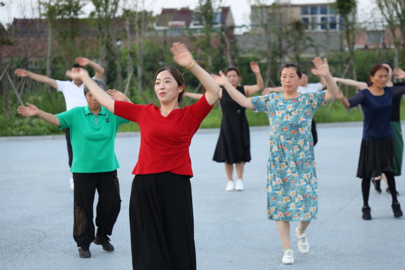 广场舞台上的惬意。每天傍晚6:30分,文化广场都会传出一阵阵欢快的音乐声,伴随着音乐的节奏,近百人舞动的身姿吸引着不少人跟着跳动比划。自文化广场建成后,农场公司特地在百姓大舞台广场安装了接电装置,为职工居民跳广场舞提供方便,舞台南侧的高杆灯光明亮,舞者们的脸上洋溢着幸福的微笑。广场建成后,退休职工黄淑英主动当起了广场舞的老师,每天领着大家一起跳操跳舞健身,一支百余人的广场舞队每天活跃在文化广场,带动了更多的职工居民加入到跳舞健身的行列。黄淑英说:每晚跳舞健身后的大汗淋漓舒服极了,不仅使全身都得到了活动和放松,增强了体质,还增进了大家之间的感情。