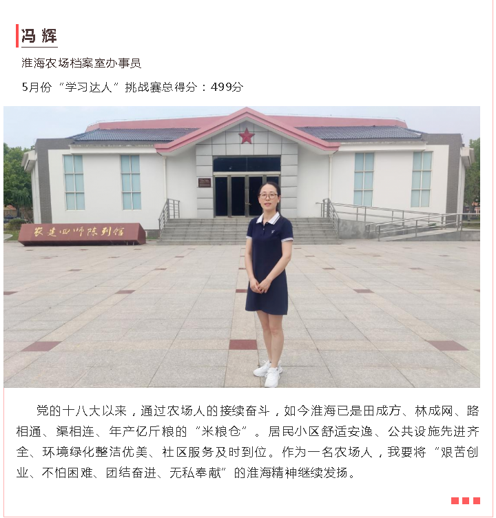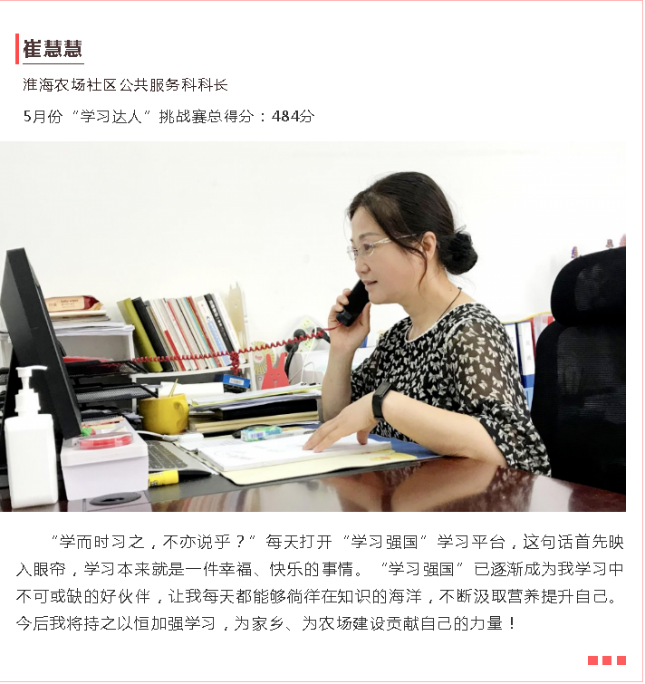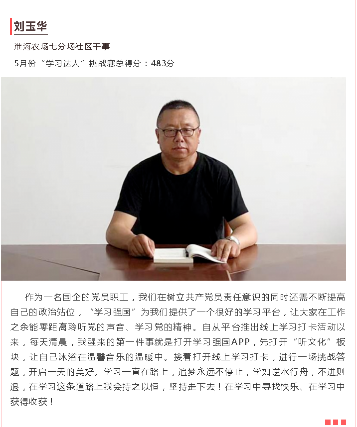为充分展示“学习达人”风采,根据射阳县“强国复兴有我”群众性主题宣传教育活动安排,射阳宣传推出“访学习达人看家乡变化”主题寻访万里行活动第一期,在全县5月份最厉害的11名“学习达人”中,淮海的“学习达人”冯辉、陈祥、崔慧慧、刘玉华跻身其中,让我们一起来听听淮海的“学习达人”们在工作中、生活上的心得感悟吧!图为淮海学员“学习达人”们的心声感悟。