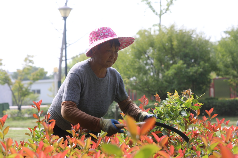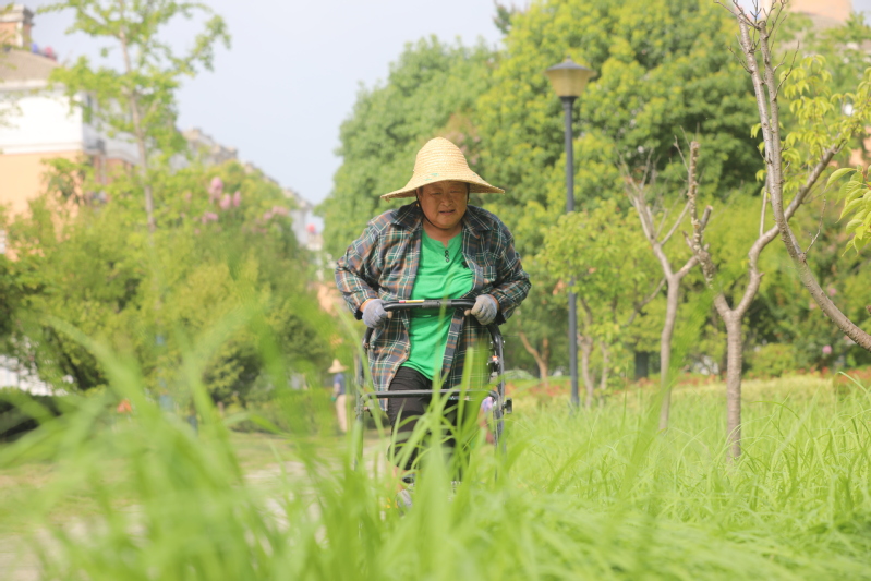 7月27日,宝应湖农场职工文化公园,7名工人正在为公园绿化除草。越是高温杂草长得越旺。以席正英为队长的绿化员们分工合作。草坪上用电动切草机清理,随着“隆隆”的机声,切碎的草屑在刀头间飞溅,溅到了工人的身上、飞上了工人的脸庞,刺痒刺痒,淡淡的青草味洋溢在夏日的晨光里。绿化带里,爬腾类的杂草枝枝蔓蔓,覆盖的绿化树上,工人们就用手先拉断经脉,再扯掉枝叶;低矮类的杂草拥挤在绿化树间,工人们蹲下身子就用手拔、用刀割。当天7名工人清理绿化300多平方米。