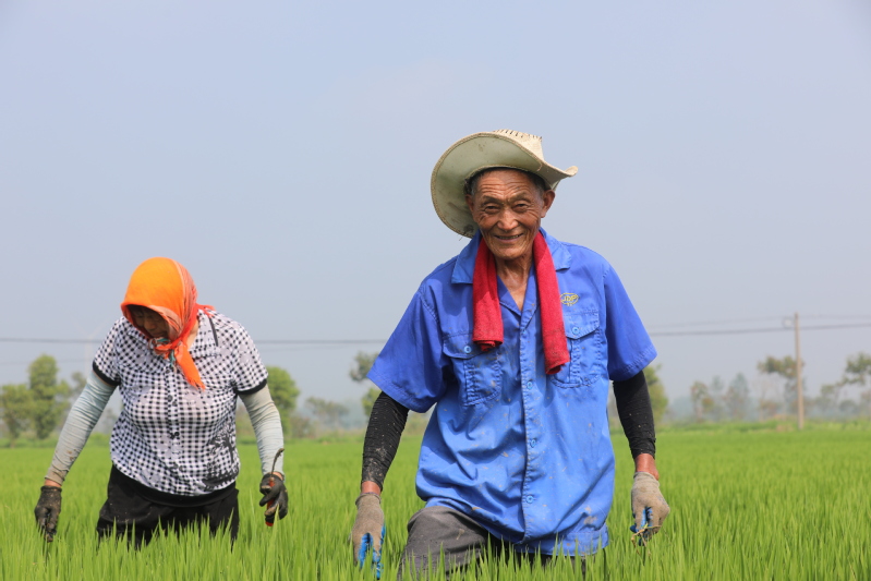 7月25日,宝应湖农场有机稻田,工人们正在拔除田间杂草杂稻。宝应湖农场有机稻种植1200亩,有机水稻生长全过程严格按照欧盟和国家有机食品标准执行,每个环节均可溯源。
