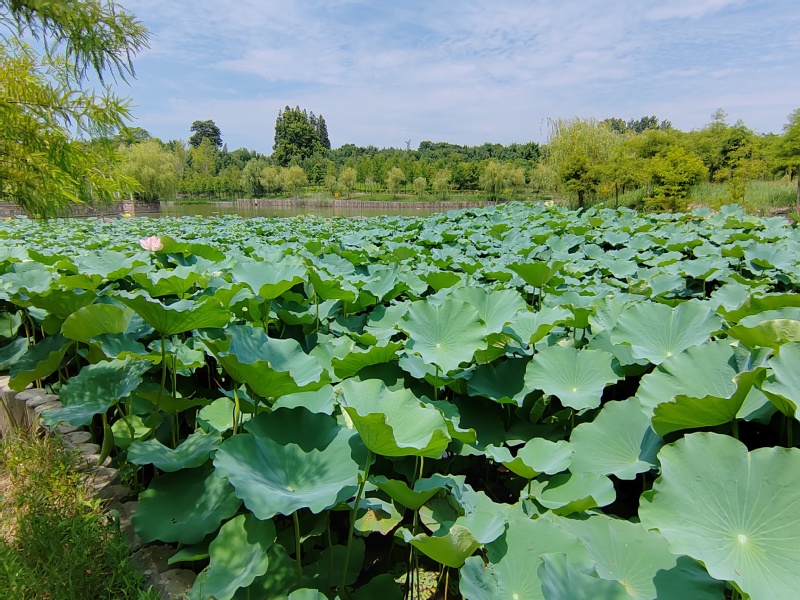 随着气温持续升高,公园内的荷花竞相开放,荷叶碧翠欲滴,展现了一副接天莲叶无穷碧,映日荷花别样红的魅力画卷,让人感受到一丝丝凉意。周边居民陈先生说:“有了荷花,这里的夏天更加漂亮了”。湖边是垂柳依依,随风浮动。荷叶一个接着一个铺了满塘,有的盛着晶莹剔透的水珠,不禁想起小时候不懂事,会把荷叶折下来,拿在手中转圈圈。