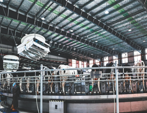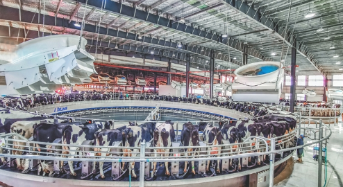 在连云港市东辛农场万头牧场内,两台80位转盘式奶牛挤奶设备正在运行,科学挤奶方式既降低了人力成本,更使挤奶效率大幅提高,全程机器操作,避免人工污染,从源头保障奶品品质。