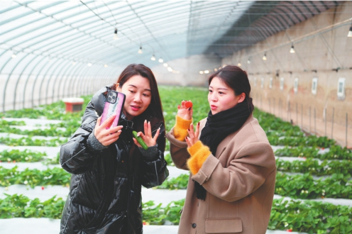 1月16日,江苏省岗埠农场富民农业科技园温室大棚内,工作人员正在抖音直播平台向消费者推介园区的果蔬、花卉产品。通过开辟线上销售“新赛道”,让手机成为新“农具”,让直播间成为新“柜台”,拓宽农产品销售渠道,带动全场温室大棚种植户增收。