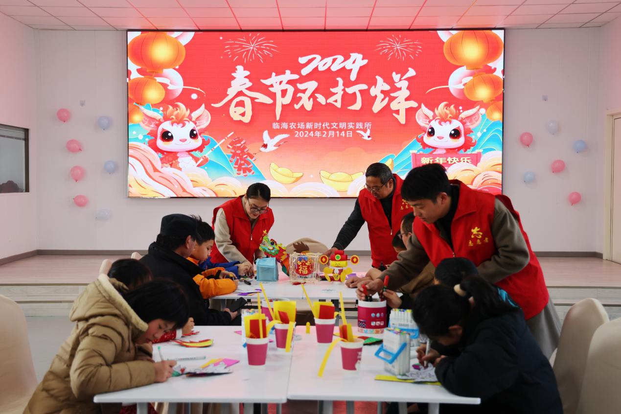 农场公司将年味“搬”进实践所,开展“春节习俗知多少”、制作龙年花灯、诵读春节经典等形式多样的活动。“古时候,有一种叫做‘年’的凶猛怪兽,每到腊月三十,便窜村挨户……”大讲堂内,志愿者正声情并茂讲起了春节的历史起源、文化内涵等基本知识,并详细介绍了“年”的传说、年夜饭、贴福字、写春联、拜年等习俗的由来以及春节礼仪的习俗。
