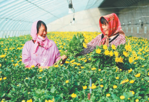 3月26日,江苏农垦岗埠农场的温室大棚内,采花工人正在采收菊花。随着清明节的临近,菊花迎来销售旺季,据大棚经营者介绍,今天是首次采花,预计将采收3000枝左右。下一步将继续加大管理力度,全力以赴做好市场保供工作。
