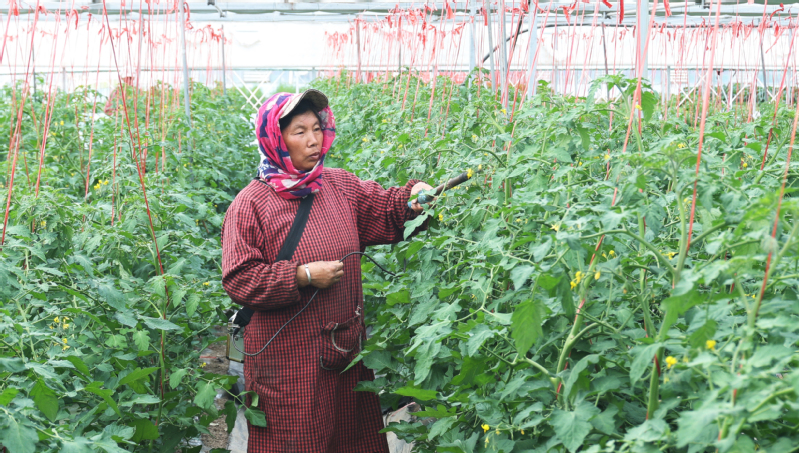 5月3日,兴垦科技工作人员在大棚里进行作物管理。图1,工作人员为新品番茄进行人工授粉,图2,工作人员为贝贝南瓜进行搭蔓。