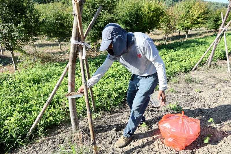 近日,在江苏省东台市新曹农场种子公司东侧东台河北樱花种植基地,园林绿化公司副经理黄步林正带领林业工人,在树下播撒“种子”。仔细观察后发现,他们实际上正在进行一项特别的工作——种植金蝉幼虫。