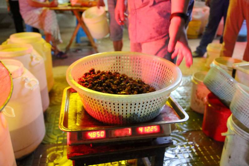 夏夜暑热退去,新曹农场河边林带、国道两侧、集镇周边,小树林里经常光影摇曳、星星点点,人们拿着手电筒等照明装备仔细在每棵树上寻摸,只为找到独属夏季的舌尖美味——金蝉。老百姓热衷抓蝉、吃蝉,价格由最初的每只0.3元到如今的每只1元左右,10年内小小金蝉身价翻了3倍,一跃成为新的致富“顶流”。“金蝉捕捉高峰期能有20多天,一家人一晚可以捉1000多元,每年靠捉金蝉就有近2万元的收益,我们这一个点一晚收购数量在5000斤以上,平均价每斤90元以上,年产值900万元。”金蝉收购点老板何成刚说。