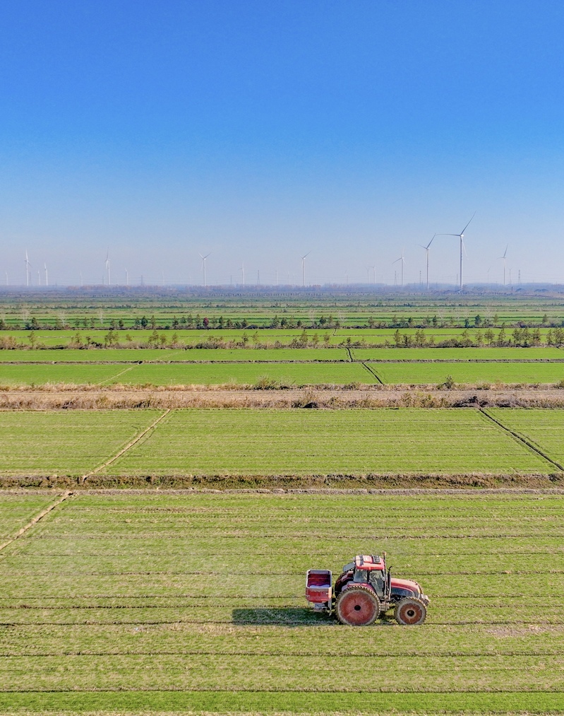 12月9日,江苏省盐城市射阳县的一座农场内,农机正在进行田间管理作业。入冬以来,农场抢抓晴好天气,实施综合田管,为夏粮增产丰收打好基础。张伟生摄(中经视觉)