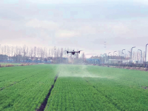 江苏农垦淮海农场使用植保无人机对大小麦田茎叶处理化除,防除田间杂草。