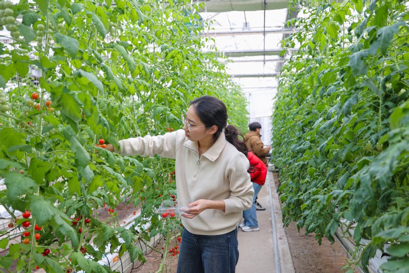 2月12日,在连云港市云台农场兴垦科技番茄采摘智能玻璃温室大棚内,工作人员在采摘采用无土栽培技术种植的西红柿。 吴成瑶 摄 (视觉江苏网供图)