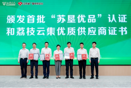 现场还举行了“苏垦优品”认证证书及“荔枝云集优质供应商”证书颁发仪式。江苏省农垦米业集团有限公司、苏州苏垦现代农业发展有限公司、金太阳粮油股份有限公司、江苏农垦渔业科技有限公司、江苏农垦乳业科技有限公司五家企业获得首批授权。