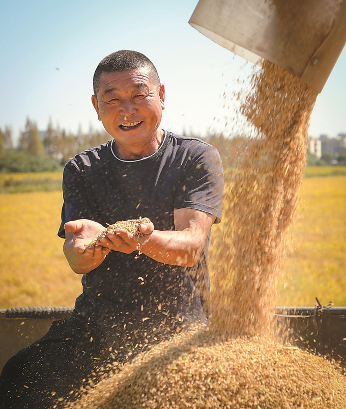10月10日,南通市海门区,江苏农垦江心沙农场500余亩“低GI”功能性水稻喜迎丰收。