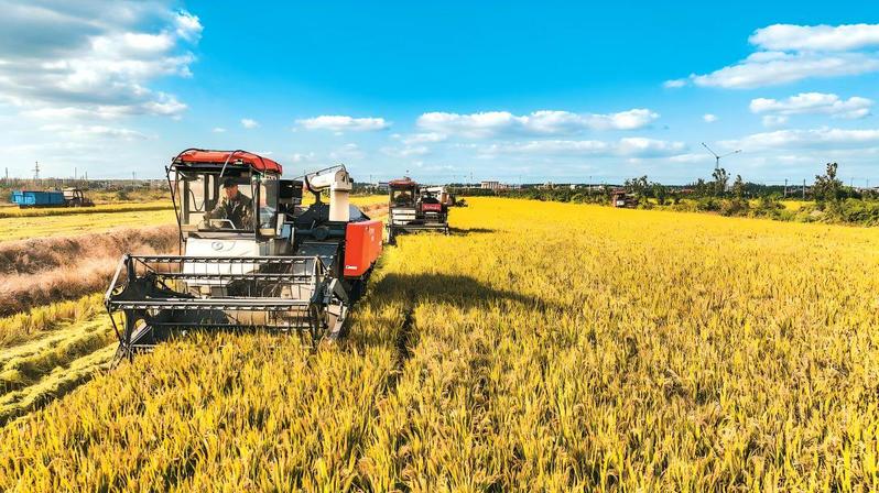 江苏省盐城市射阳县,江苏农垦新洋农场工作人员抢收水稻。