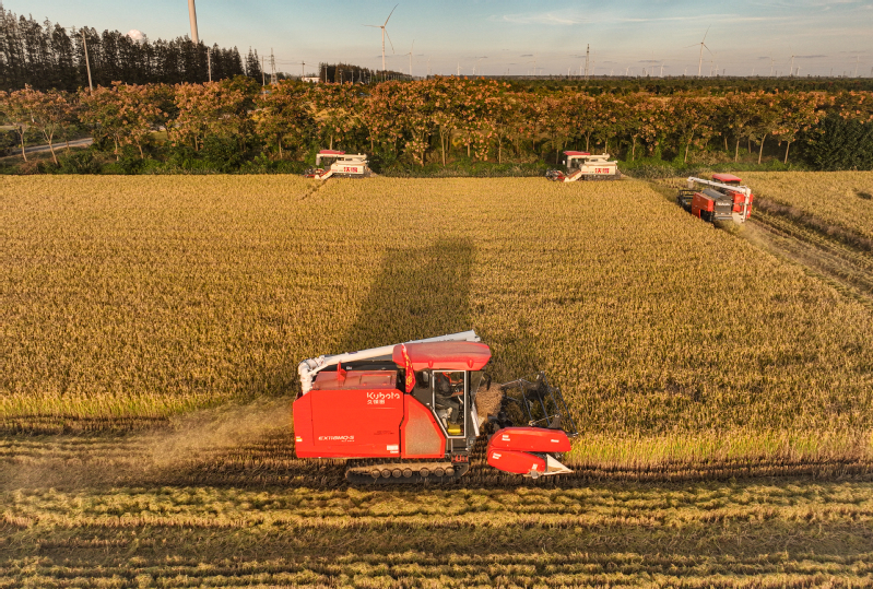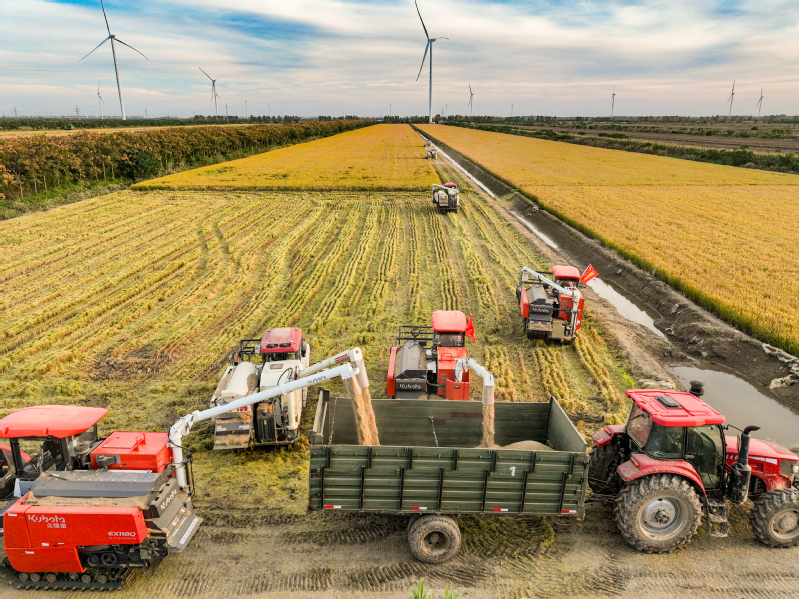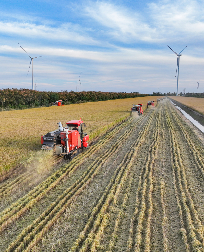 11月3日,江苏省盐城市射阳县新洋农场组织收割机械,对高标准农田中的优质水稻进行抢收作业,确保秋粮颗粒归仓,不误农时。 作者:张伟生