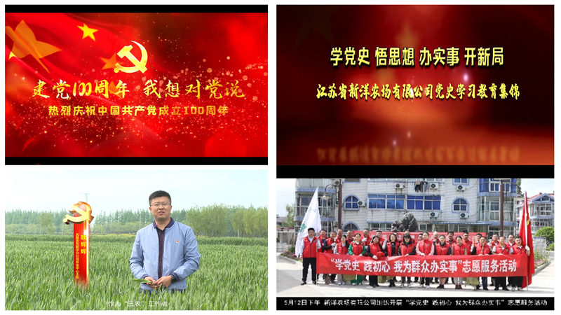 为庆祝中国共产党成立100周年,向党的百年华诞献礼,5月上旬,新洋农场有限公司拍摄制作以“学党史 悟思想 办实事 开新局”为主题的微视频,其中《党史学习教育视频集锦》、《建党100周年 ,我想对党说》等微栏目在农场公司微信公众号、电视、电子显示屏等媒介滚动播放,营造了浓厚的学史氛围。