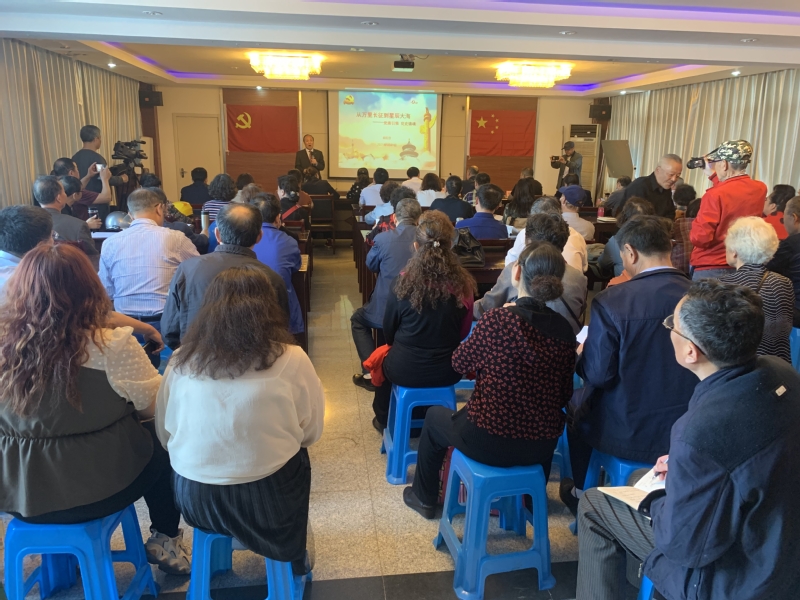 伴随着原江苏生产建设兵团三师十七宣传队队员自创的原唱歌曲《放声歌唱共产党》优美、动听的歌声,大会拉开了序幕,全场座无虚席,空隙处还增放了多张座凳,济济一堂,聆听昔日的兵团战士,如今河海大学商学院原党委书记,上海交大客座教授顾宏言的党史讲课,《从万里长征到星辰大海——党旗引领党史铸魂》。