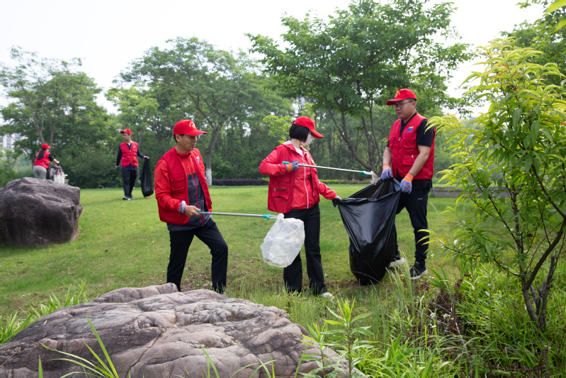 遇到卫生死角中的垃圾纸屑,志愿者便俯下身,用铁钳或手套将其拾起,放入随身携带的垃圾袋中。活动中,公园内一位晨练的阿姨被公司志愿服务队的环保善举所感染,自愿加入捡拾垃圾志愿服务中。