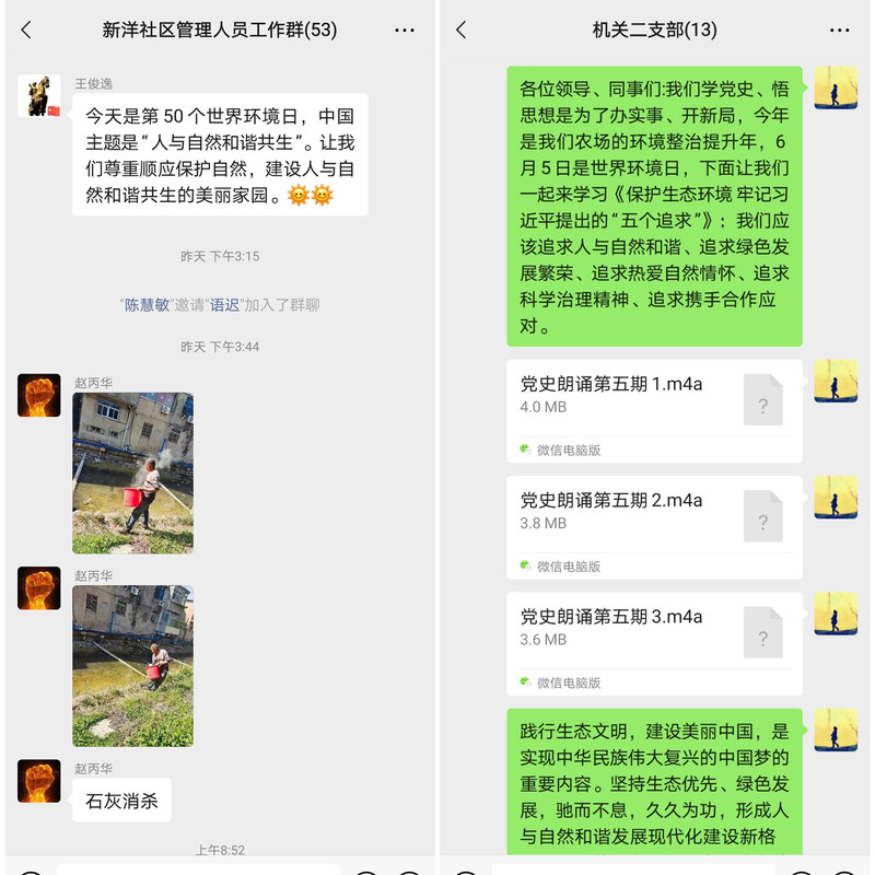 机关二支部则把党史教育与环境整治相结合,通过支部党史朗诵专题学习《保护生态环境牢记习近平提出的“五个追求”》,要求大家在农场公司党委的领导下,追求人与自然和谐、追求绿色发展繁荣、追求热爱自然情怀、追求科学治理精神、追求携手合作应对,坚持生态优先、绿色发展,驰而不息,久久为功,以更美的环境面貌庆祝建党百年、迎接建场70周年。