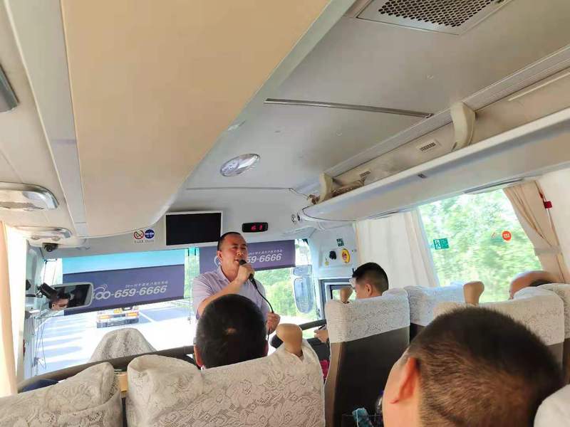 这是6月4日下午2点多钟,在主题为“学习百年党史 铭记初心使命”的党史学习教育活动结束后,淮海农场社区党总支结合本次参观南京大屠杀纪念馆、雨花台纪念馆、徐州抗日战争纪念馆、淮海战役纪念馆及茅山爱国主义中心等地开展党史学习实境红色教育的基础上,在回程的旅途中,结合本总支实际,在20多名基层党组织书记中,开展了一场党史学习教育测试竞赛时的活动场景。