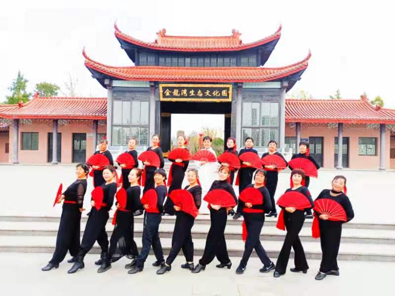 图为城西居委会党支部宣传委员杨秀媛,发挥特长,热心带领居民学跳歌颂共产党的红色节目。