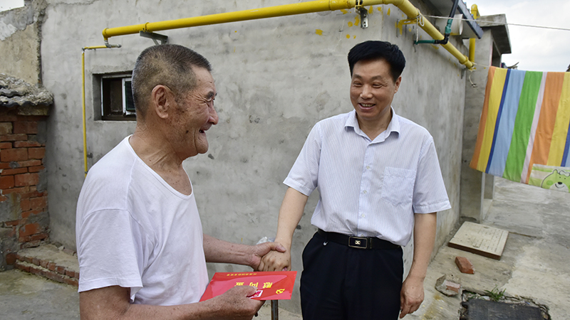 在健康居委会老党员邵恒江家,姚春华与邵恒江亲切握手,并代表农场公司党委向他表示崇高的敬意和诚挚的问候,还向他送上了省国资委党委的节日慰问金。