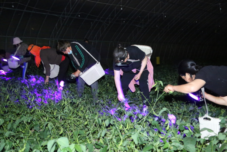 5月12日夜间,在岗埠农场高效农业示范园一处豆丹养殖基地,工作人员利用紫光灯在黑夜里收获豆丹成虫。当前正是豆丹大量上市的时节,当地抢抓农时,加紧收获豆丹成虫供应市场。