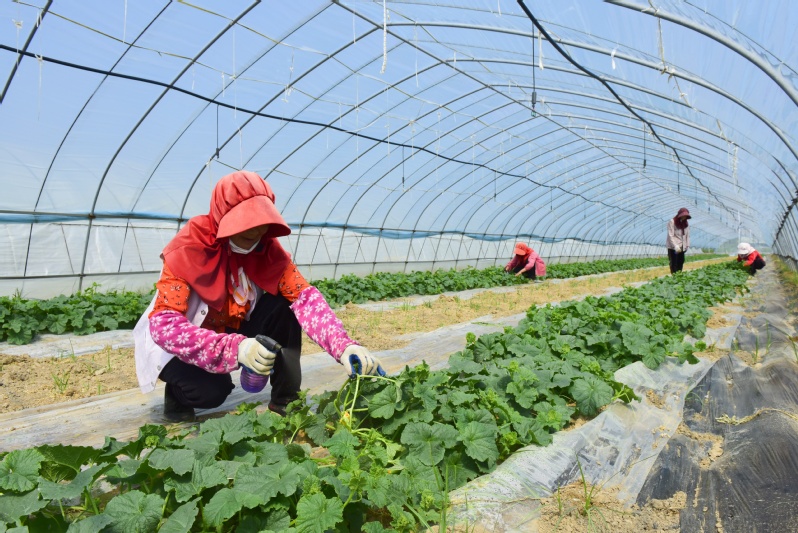 走进淮海农场高效种植园,大棚内一株株青翠欲滴的甜瓜苗郁郁葱葱,一朵朵黄灿灿的小花竞相绽放、长势喜人。目前正值授粉关键期,工人们在棚内来回穿梭,精心授粉,为今年的丰收打好基础。据了解,农场采用“羊肚菌+甜瓜”的轮作模式,利用种植菌菇改良后的土壤栽种甜瓜,达到提升甜瓜品质,一棚两收、激活土地效益的目的。