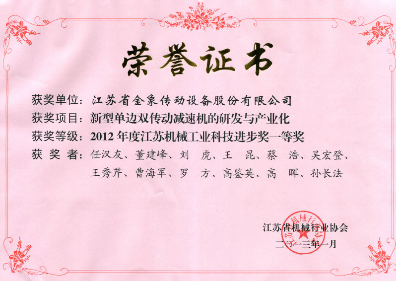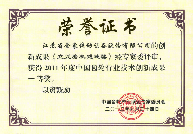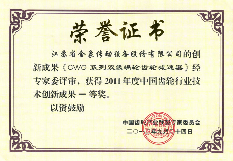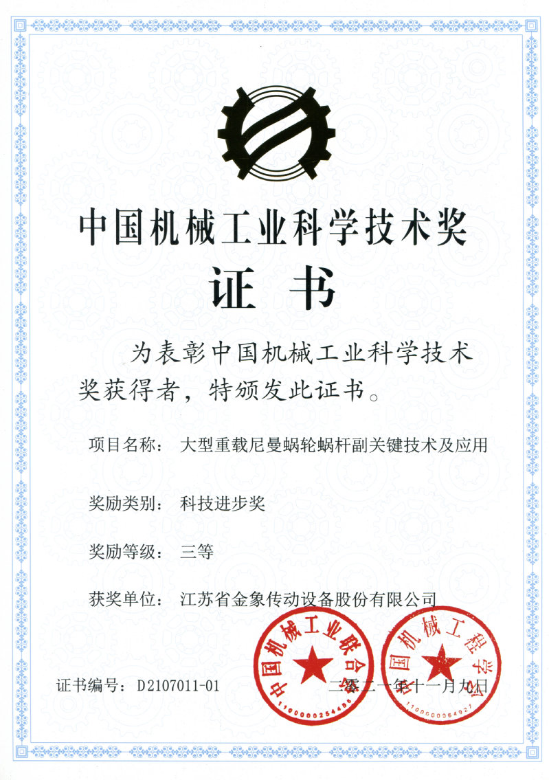 公司获得多项行业或省级奖项:公司研发的“大型重载尼曼蜗轮蜗杆副关键技术及应用”获批2021年度中国机械工业科技进步三等奖,“多分流立式磨机传动装置”获批江苏省专精特新产品,新型立式磨机减速器的研发与产业化获得中国机械工业科学技术奖三等奖;新型单边双传动减速机的研发与产业化获2012年度江苏机械工业科技进步一等奖;CWG系列双级蜗轮齿轮减速器、立式磨机减速器被授予中国齿轮行业技术创新成果一等奖。