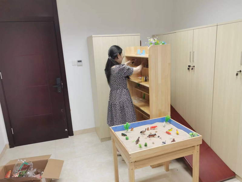 目前,淮海农场社区民政办正紧锣密鼓的建立服务流程和日常管理需要的各类制度,建立健全困境儿童台账和活动台账,预估10月底前,“淮海农场未成年人保护站”的各项设施完善配置,并正式开放。图为社区民政办工作人员正布置心理咨询室设施。