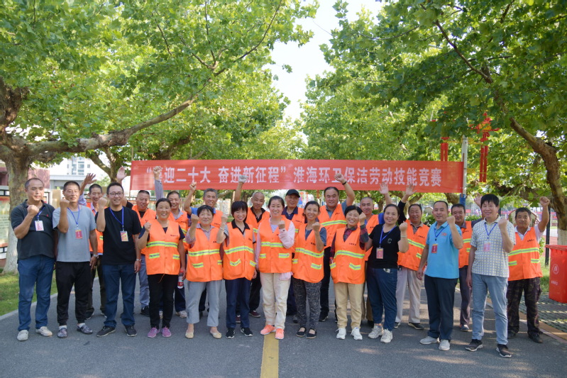 淮海农场社区绿化环卫所的环卫职工,他们用辛勤的汗水和勤劳的双手,守护着美丽淮海的“颜值”。环卫人员也以他们兢兢业业的劳动成果,赢得了农场职工居民的广泛赞誉和尊重。图为结束比赛的环卫职工和裁判人员开心地在标语横幅下合影留念。