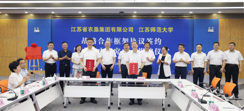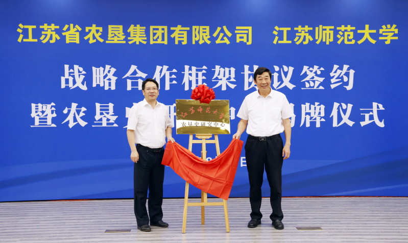 8月10日上午,集团公司与江苏师范大学战略合作框架协议签约暨农垦史研究中心揭牌仪式在徐州举行。集团公司党委书记、董事长魏红军,江苏师范大学党委书记方忠出席并致辞。集团公司党委副书记、总经理胡兆辉与江苏师范大学党委副书记、校长周汝光共同为江苏师范大学农垦史研究中心揭牌。集团公司党委副书记姚准明与江苏师范大学党委常委、副校长蔡国春共同签署《战略合作框架协议》。江苏师范大学农垦史研究中心主任岑红发言。集团公司党委委员、总会计师刘克英,党委委员、纪委书记李旭东,副总经理刘耀武,党委委员、副总经理王立新,党委委员、工会主席杨义林,江苏师范大学党委常委、党委宣传部部长孟召学,党委常委、党委统战部部长、党委办公室主任商亮出席。