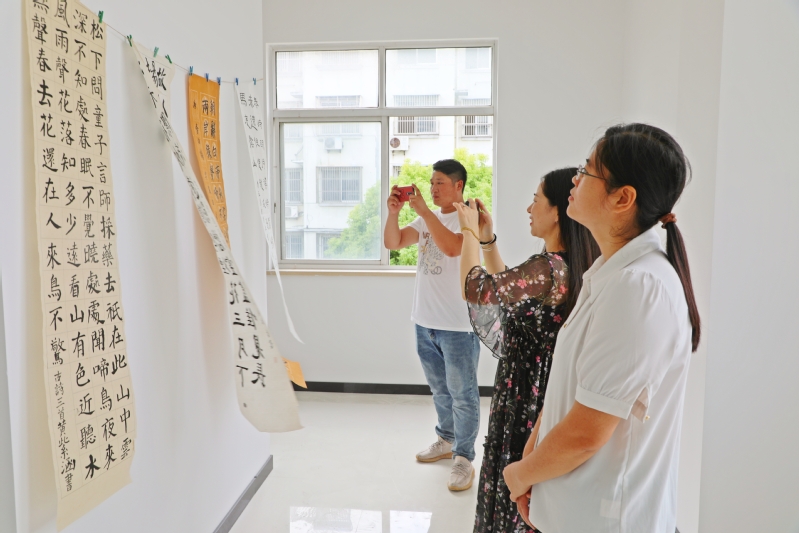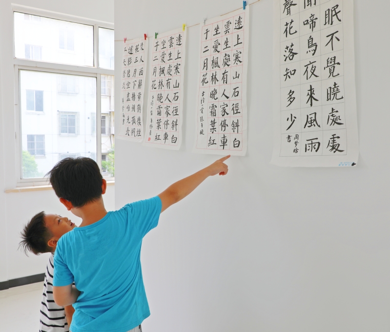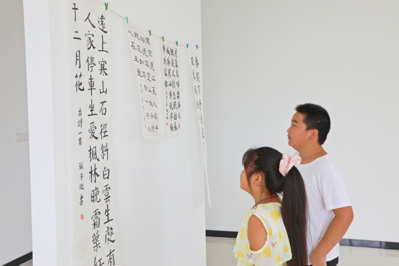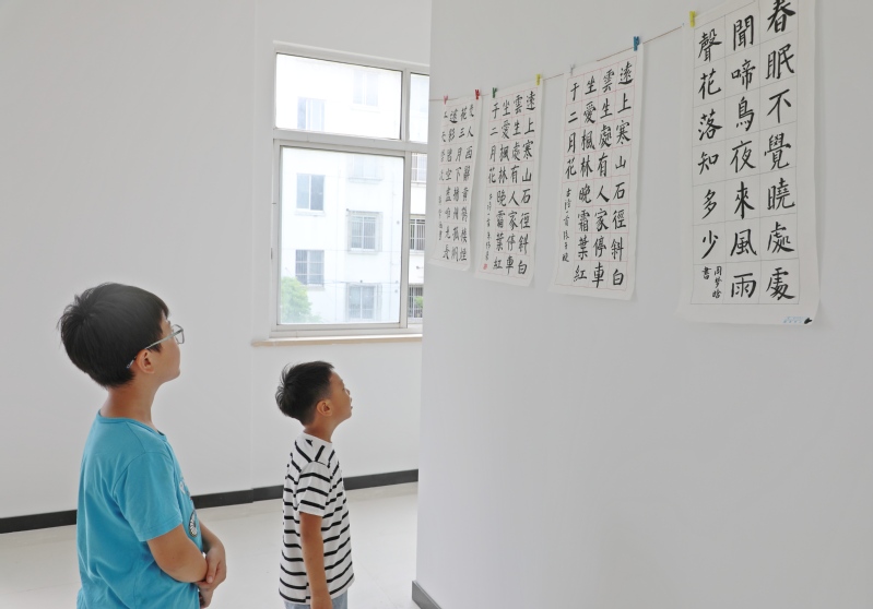8月28日,在江心沙职工书屋二楼,一场为期一周,象征着收获的青少年书法展,吸引了不少职工居民和学生前来观览。图为“书迷”们观摩“暑期公益课堂·书法班”“结业”作品的温馨场景。