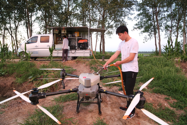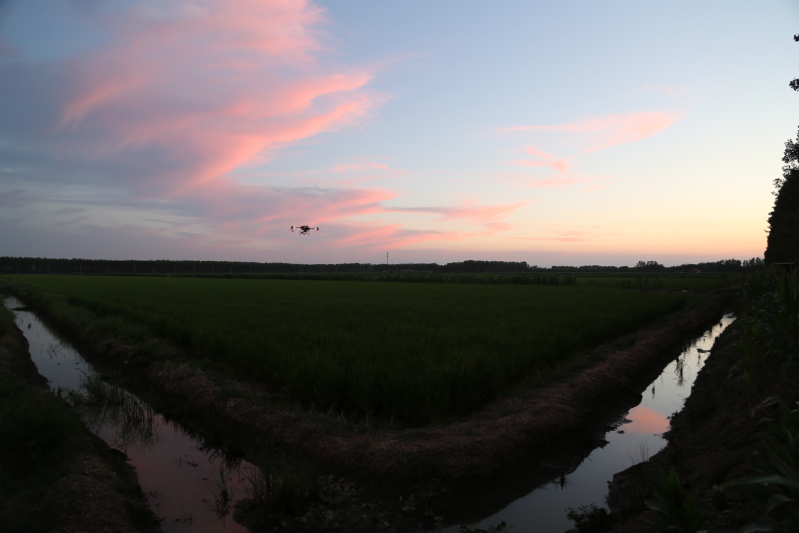 “这块地是梯形的,等会这块地飞完,要把地边找一找,防止漏飞。”8月30日晚,在苏垦农发岗埠分公司王沟生产区葛庄队的一处田边,大队管理员葛高树正和无人机飞手进行交流,叮嘱操作注意事项。在田间,一架大型无人机闪烁着灯光,在飞手的操作下有条不紊地进行喷施作业,所到之处卷起阵阵白雾。