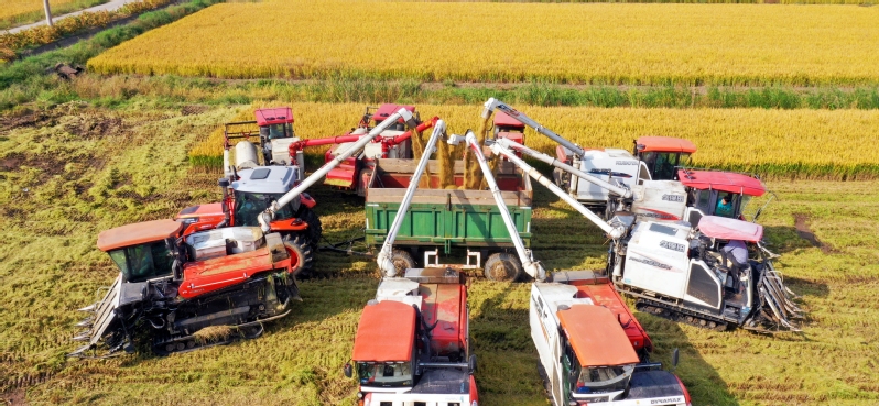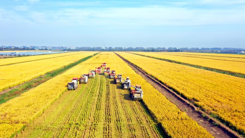10月25日,苏垦农发江心沙分公司抢抓晴好天气,组织收割机集中开展大规模水稻收割作业,切实将“丰收在望”转化为“丰收到手”,彰显农业“国家队”担当。收割现场,收割机、运粮车来来往往,一片繁忙景象。