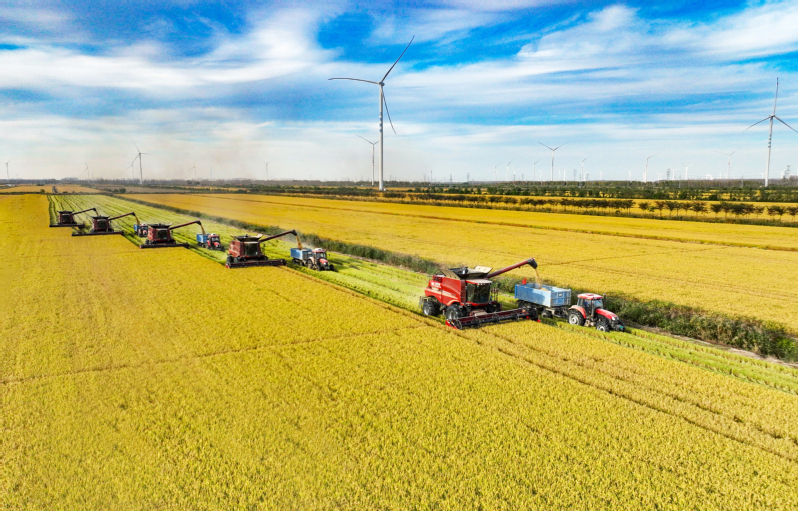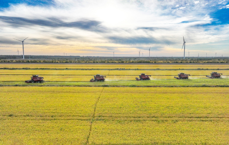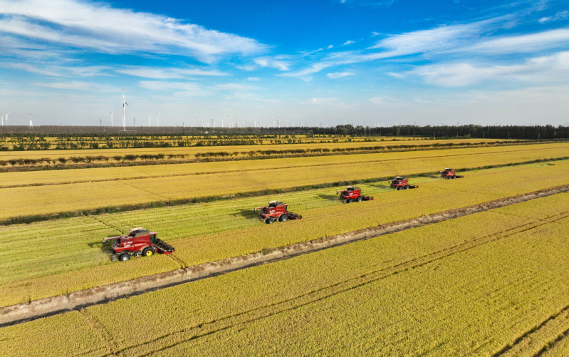 2023年10月28日,在苏垦农发新洋分公司新南生产区19大队的高标准农田上,五台凯斯7088大型联合收割机穿梭在稻田中抢收水稻。苏垦农发新洋分公司抢抓晴好天气,发挥农垦企业机械化优势,确保秋粮颗粒归仓。