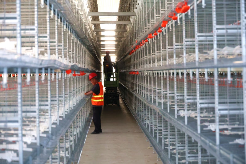 近日,新曹农场抓好抓实百万羽蛋鸡产业项目工程建设,全力以赴加快工程进度,确保年底一期工程完工,冲刺四季度。图为现代化鸡舍内部,工人紧锣密鼓安装、调试鸡笼设施。