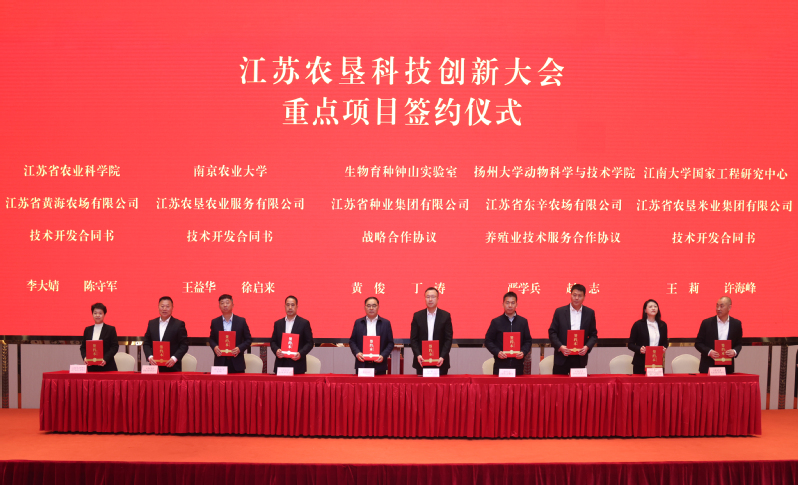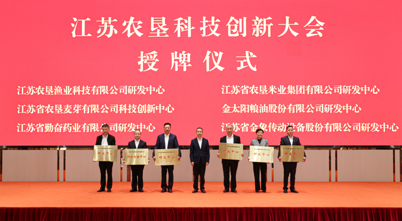 会上,吴本辉、姜建友共同为江苏农垦渔业科技有限公司和江苏省农垦产业技术研究院有限责任公司揭牌,吴本辉为苏垦渔业研发中心、苏垦米业研发中心、苏垦麦芽科技创新中心、金太阳粮油研发中心、勤奋药业研发中心、金象传动研发中心授牌,姜建友发布江苏农垦2024-2025年揭榜挂帅项目榜单,生物育种钟山实验室、省农科院、南京农业大学、江南大学、扬州大学分别与集团公司所属企业签署重点项目合作协议。