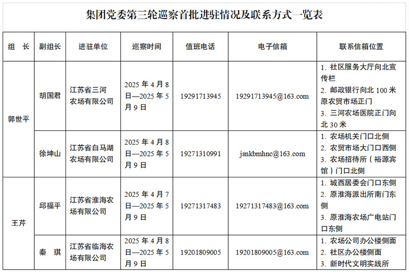 集团党委巡察组将在被巡察农场现场巡察1个月左右,期间设立专门值班电话、电子信箱、联系信箱等,主要受理反映被巡察农场党委领导班子及其成员、相关重点岗位干部(含已离退休、已调离)问题的来信来电来访,重点是关于违反政治纪律、组织纪律、廉洁纪律、群众纪律、工作纪律和生活纪律等方面的举报和反映。其他不属于巡察受理范围的信访问题,将按规定由有关部门认真处理。信访受理时间截止到2025年5月7日。