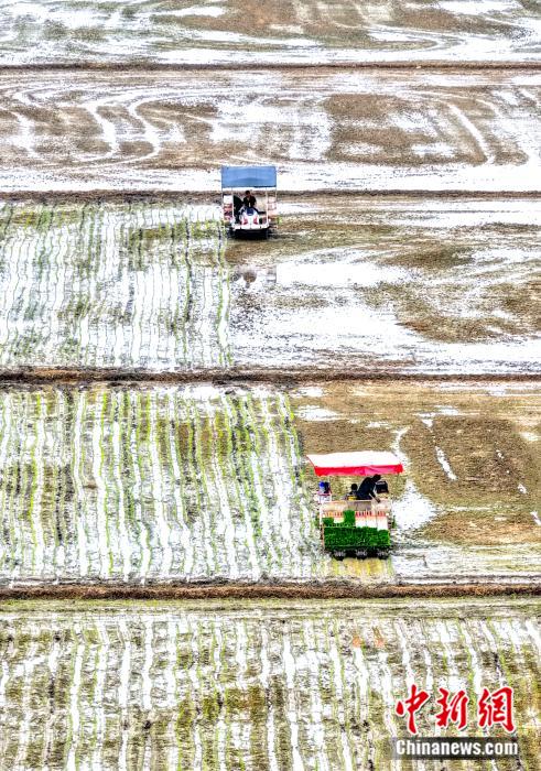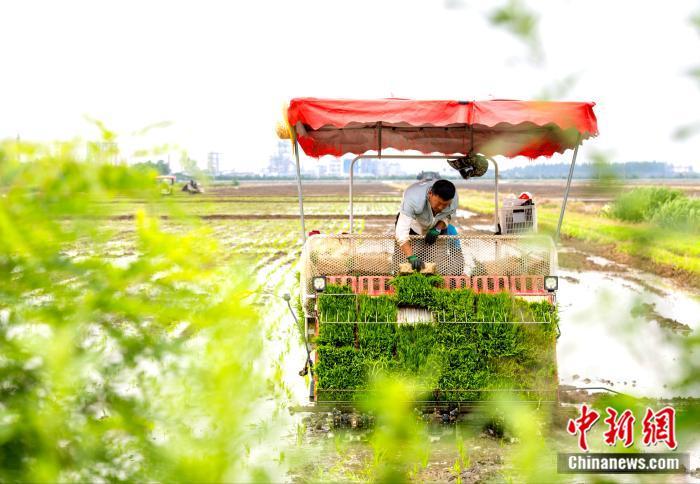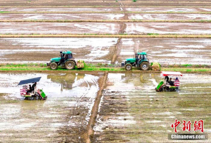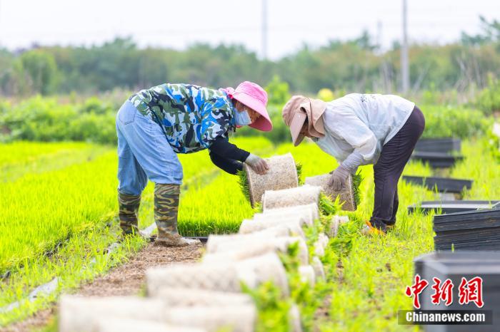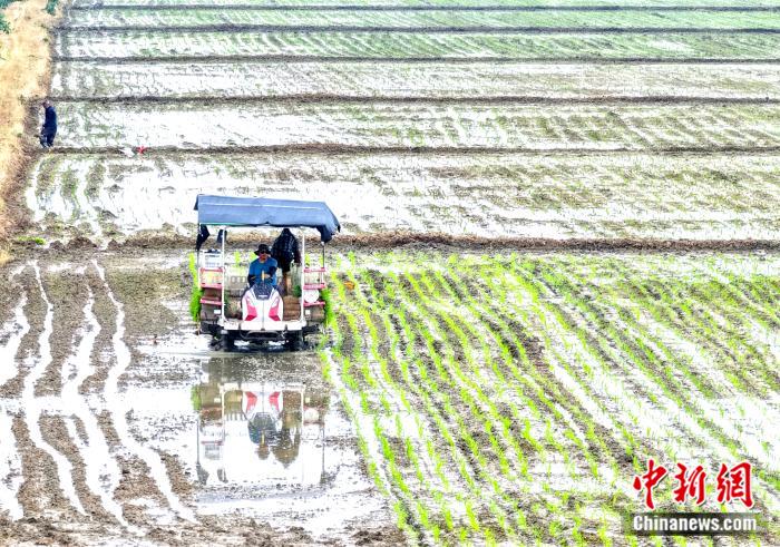 6月11日,江苏省盱眙县三河农场,农民正在进行机插秧作业。据了解,三河农场2025年水稻种植面积4.1万亩,机插秧比例达到96-97%,机插秧不误农时,比往年半人工插秧普遍缩短3~5天时间。 图/CNSphoto 许昌银 摄