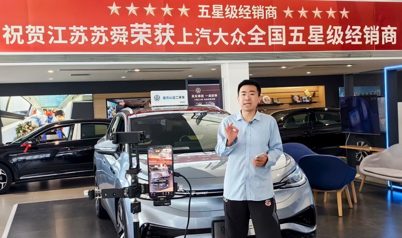 苏舜公司创新“直播+服务”销售模式,重点发力“抖音、小红书”等平台,加大直播场次与粉丝互动,将留资转化率提升至12%,平均观看时长达到23分钟。图为工作人员在直播间提供二手车在线置换评估、金融方案计算等服务。